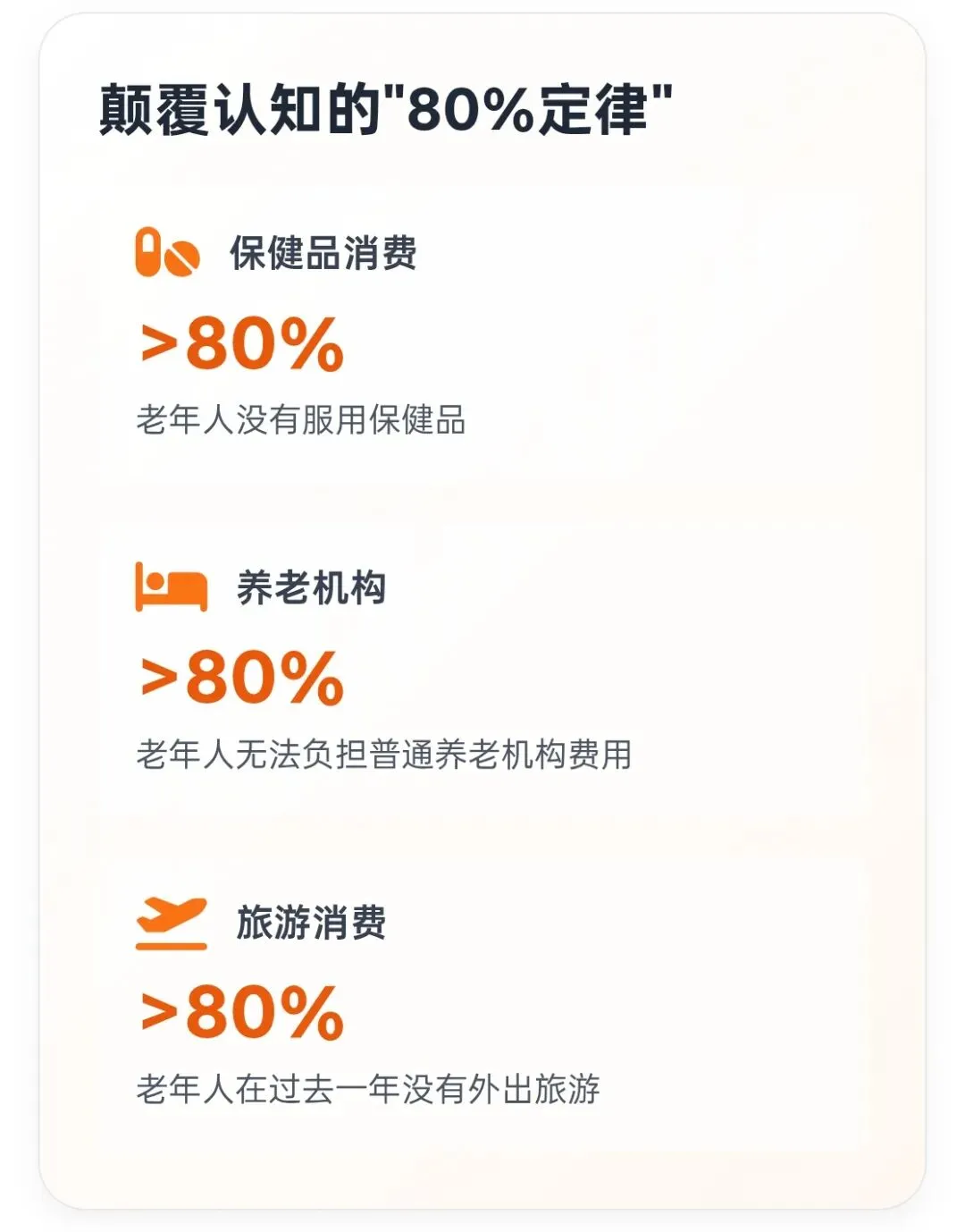 然而,在这个庞大的银发市场背后,却隐藏着一个被广泛误解的真相。与市场上普遍宣扬的"银发消费升级"叙事不同,青山资本的研究揭示了一个**"80%定律"**:超过80%的老年人没有服用保健品,超过80%的老年人无法负担普通养老机构费用,超过80%的老年人在过去一年没有外出旅游。这一数据彻底颠覆了人们对"有钱有闲"老年群体的刻板印象。