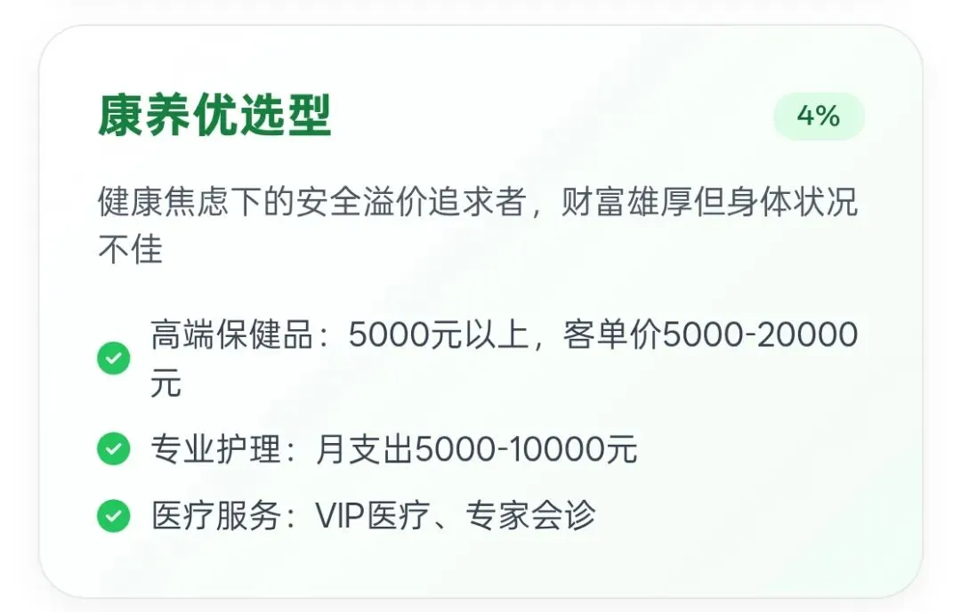 - 心理特征:愿意为健康和省心支付高昂的溢价,追求安全感