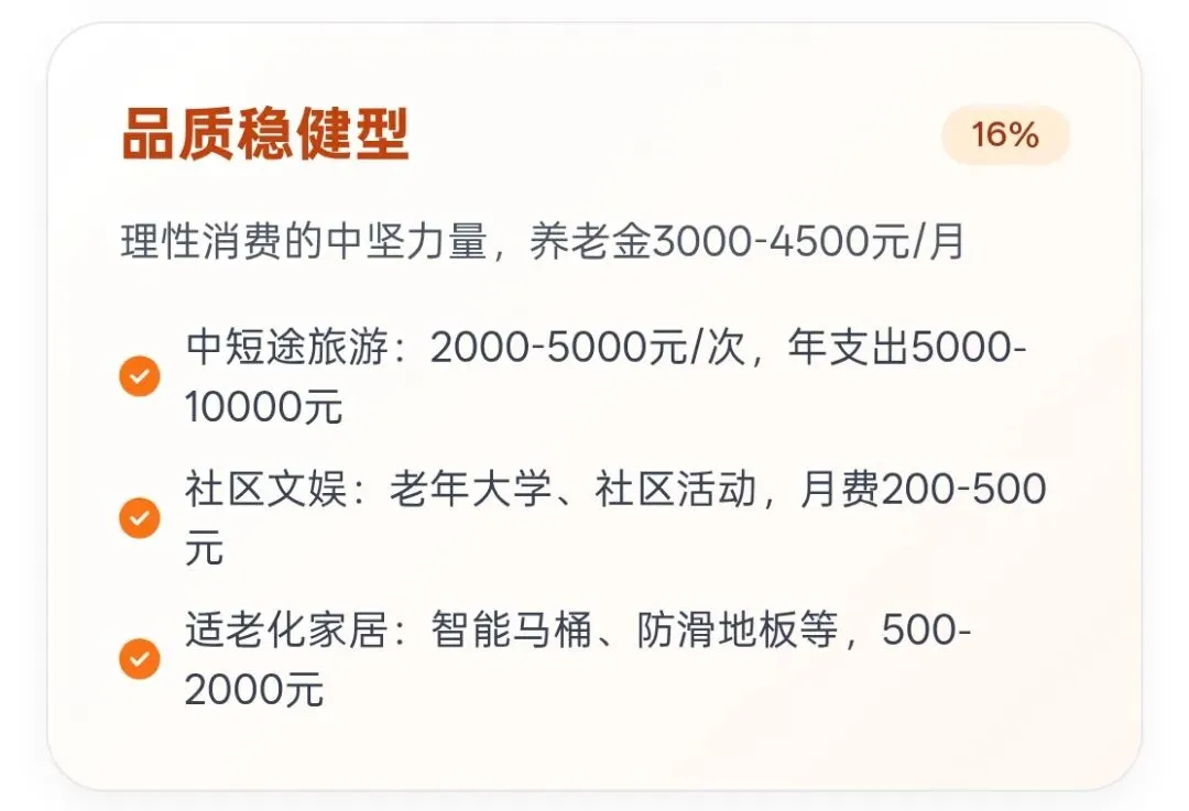 人群画像:品质稳健型老年人占比16%,是四类人群中规模最大的,数量约4960万人。他们属于城市普通中产,养老金在3000-4500元/月,家庭住房相对稳定,子女经济独立,健康状况较好,数字素养偏上。