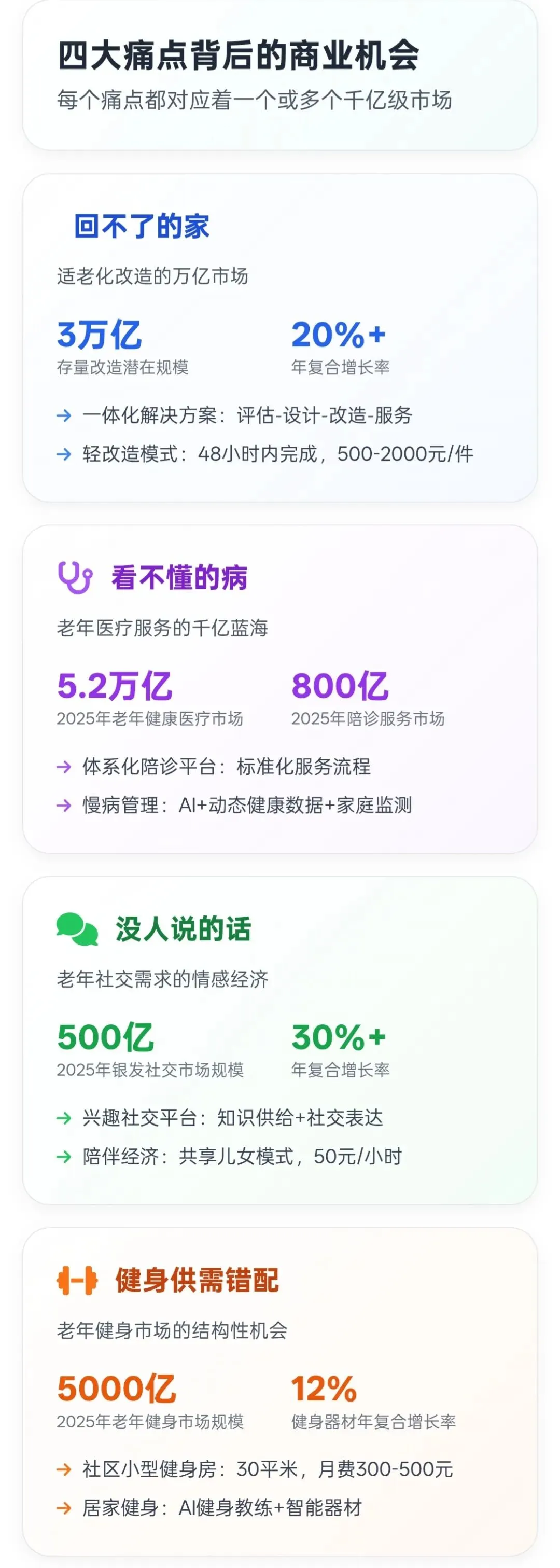 青山资本在报告中深刻揭示了中国老年人面临的四大生活痛点:回不了的家、看不懂的病、没人说的话、健身供需错配。这些痛点不仅反映了老年人生活的真实困境,更蕴含着巨大的商业机会。每个痛点都对应着一个或多个千亿级市场,关键在于如何精准把握需求并提供解决方案。