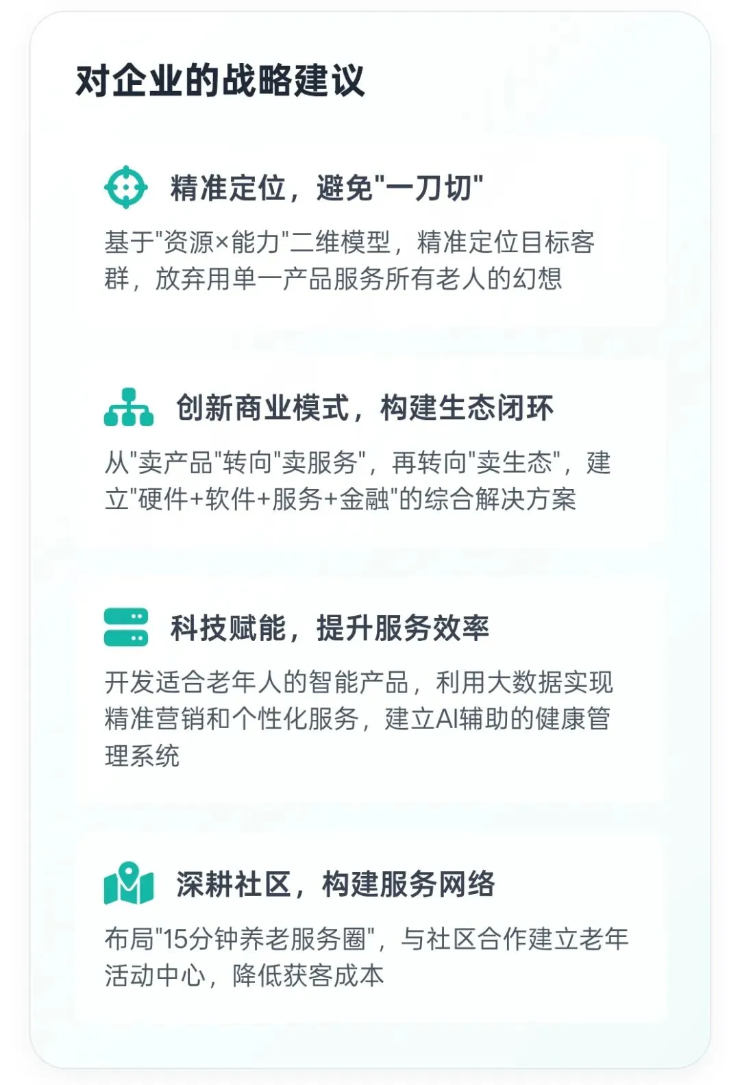 基于以上分析,对进入银发经济领域的企业提出以下战略建议: