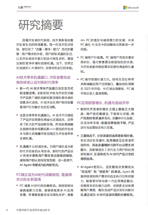 报告指出开发者需向 “认知减负者” 转型,应用商店成为破局关键,通过信任背书、精准分发与全生命周期服务破解流量难题。AI Agent的兴起将重塑分发逻辑,为PC应用生态注入长期增长动力。