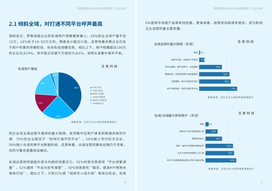 见实《增速不可忽略、投入加码与行业分层:零售商超私域与全域调研报告》显示:行业正在进入深水区。七成企业的私域用户规模仍不足50万,而头部已突破百万甚至千万;70%的企业卡在用户体系打通环节,56%缺乏跨平台数据系统,组织协同成了最大短板。