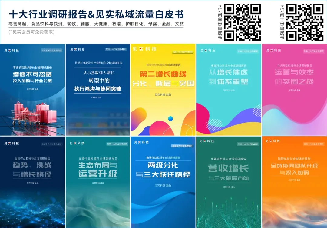 PS:见实10大行业私域/全域调研报告,包括:护肤日化、零售商超、食品饮料与快消、餐饮、大健康、鞋服、母婴、教培、金融、文旅,欢迎下方扫码订阅。
