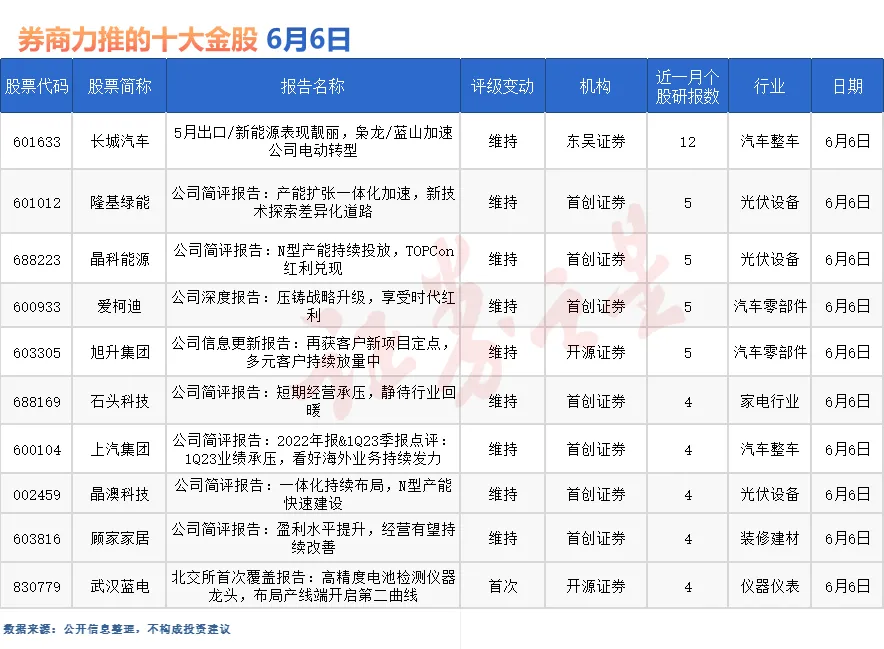 具体来看,长城汽车近一个月获华西证券、财通证券、中泰证券、天风证券等12份券商研报关注,位居6月6日券商力推股榜首。