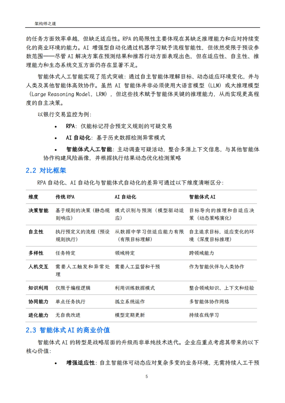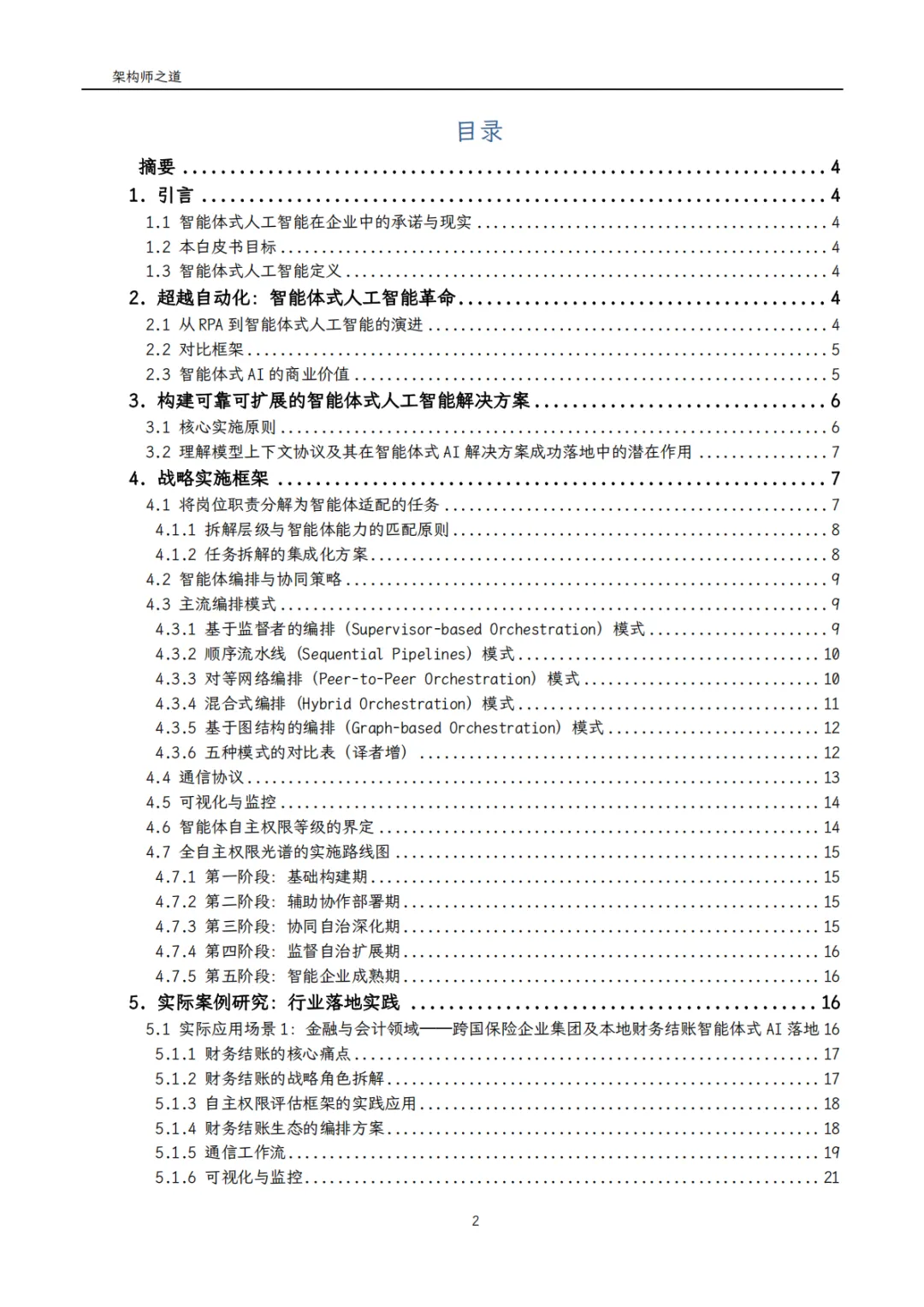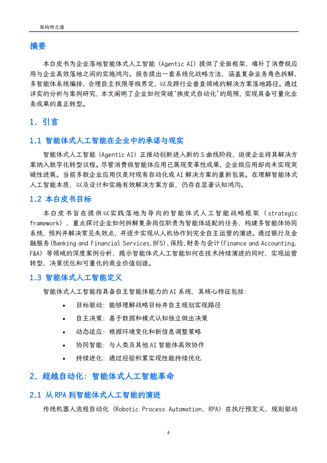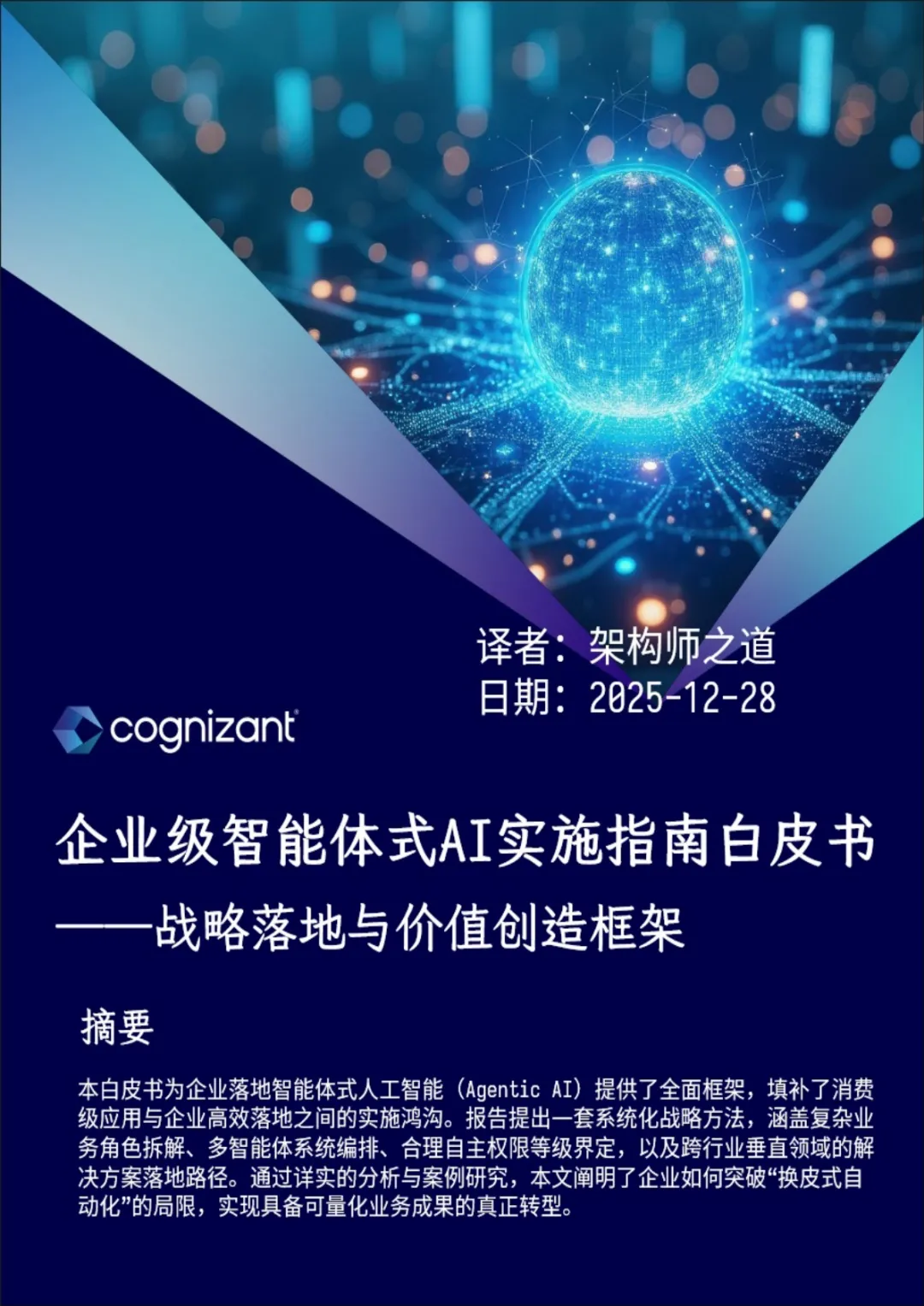 本白皮书为企业落地智能体式人工智能(Agentic AI)提供了全面框架,填补了消费级应用与企业高效落地之间的实施鸿沟。报告提出一套系统化战略方法,涵盖复杂业务角色拆解、多智能体系统编排、合理自主权限等级界定,以及跨行业垂直领域的解决方案落地路径。通过详实的分析与案例研究,本文阐明了企业如何突破“换皮式自动化”的局限,实现具备可量化业务成果的真正转型。