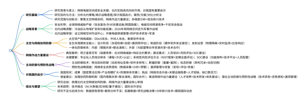 本报告以北约网络与电磁空间防御为研究核心,剖析了其在太空与网络协同防御、网络作战力量建设方面的策略、实践与发展趋势,指出北约明确太空资产面临 DDoS、中间人、勒索软件等网络威胁,在太空系统全生命周期融入网络安全建设并构建一体化太空 - 网络防御体系,同时以荷兰皇家空军为典型推进网络作战力量的专业化建设,强化主动防御与预防性战略;还分析了我国网络与电磁空间防御的成果与挑战,提出借鉴北约经验的相关建议,并展望了该领域新兴技术融合、国际合作深化的未来趋势,也指出研究存在数据获取和案例分析的局限性及后续研究方向。