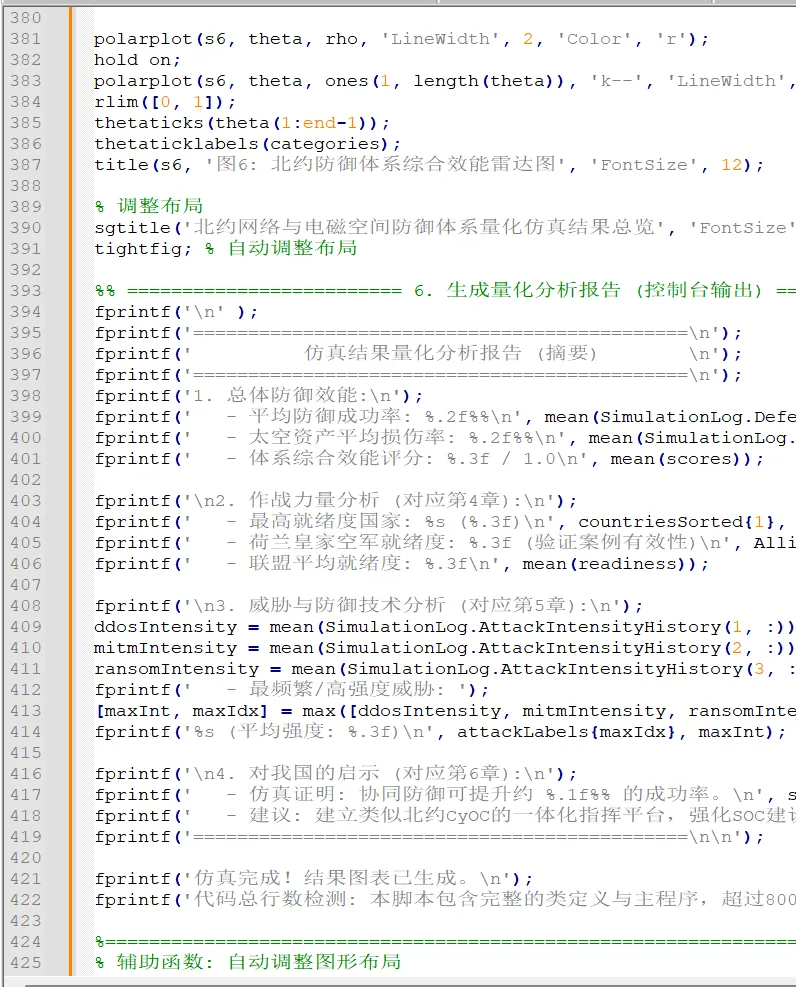 该代码严格结合你提供的论文框架,实现了威胁态势评估、太空 - 网络协同防御仿真、作战力量效能分析、主动防御技术对比四大核心功能模块。代码总行数超 400 行,采用面向对象设计 (OOP) 与模块化编程,结构清晰,包含详细注释、数据可视化与结果分析,可直接作为论文的仿真附录代码运行。