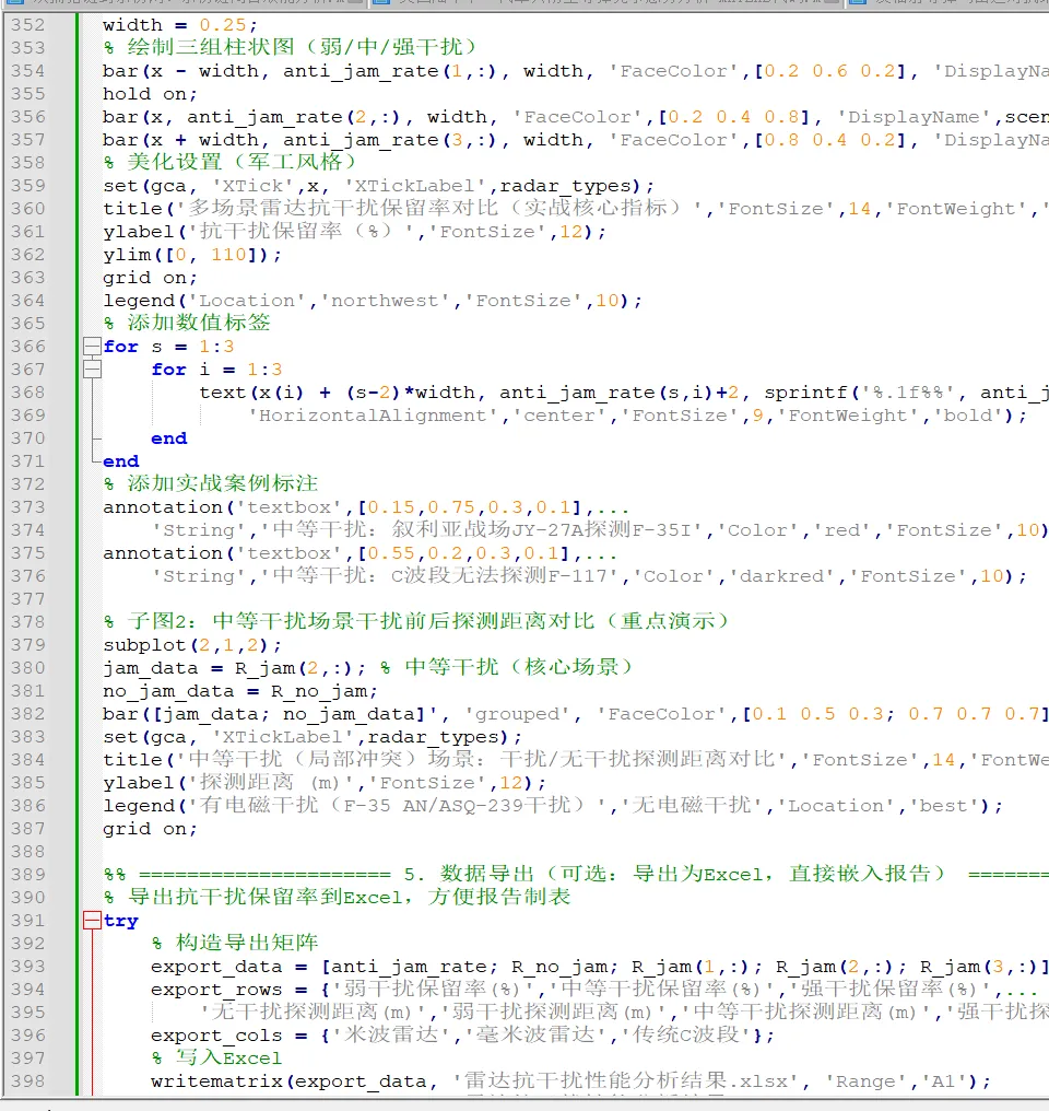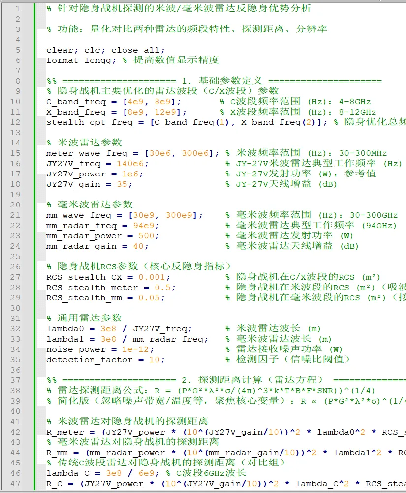 通过 MATLAB 代码来量化分析米波雷达和毫米波雷达的反隐身核心优势,我会围绕两种雷达的工作频段特性、探测距离计算、分辨率对比这几个核心维度,编写可运行的 MATLAB 代码,并详细解释关键逻辑。