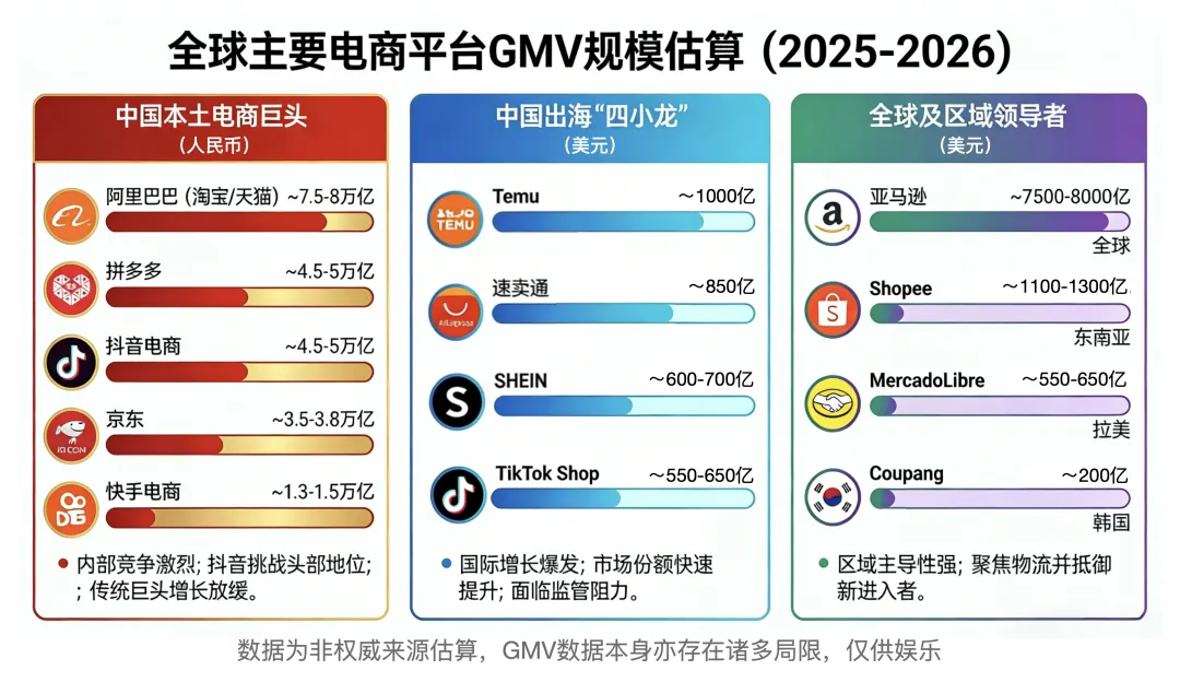 以下是一张经粗略估算的海内外电商GMV对比,相关信息未必准确,仅供娱乐。
