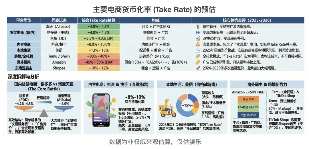 亚马逊:它的Take Rate极高(>30%)。为什么?因为它不仅收佣金,还收仓储费、配送费和广告费。这是典型的“基础设施变现”。