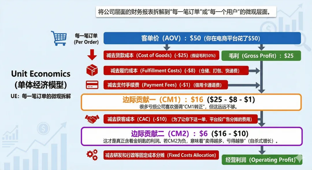 UE,全称Unit Economics(单体经济模型),是将公司层面的财务报表拆解到"每一笔订单"或"每一个用户"的微观层面。