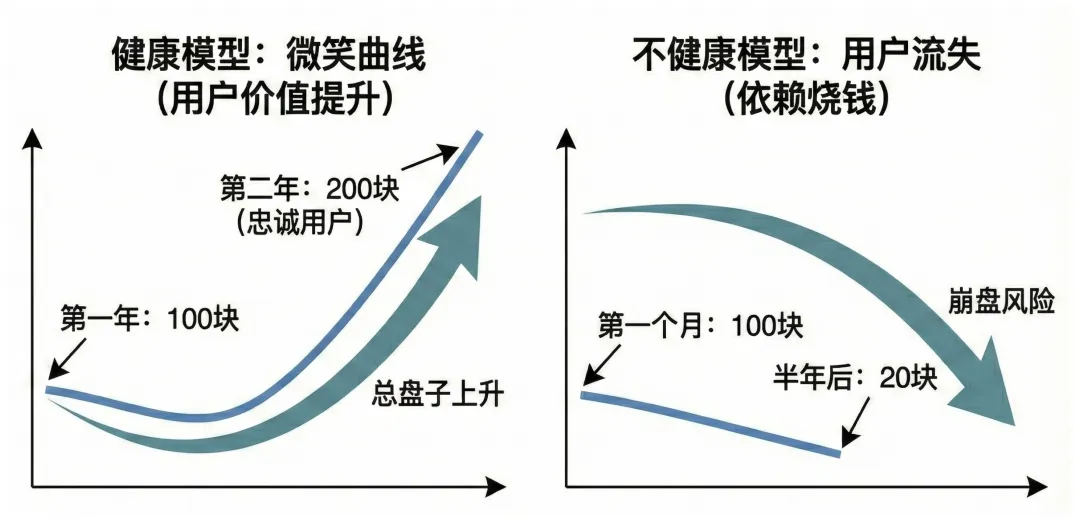 健康的平台应该是这样的:比如第一年进来的用户,平均每人花 100 块;到了第二年,虽然有一部分人走了,但留下的那些 “老粉”,平均每人能花 200 块。这么算下来,总消费额不仅没降,反而还涨了。像这种靠老用户 “提价值” 就能稳住甚至扩大盘子的,根本不用天天想着 “必须买新用户才能活”。