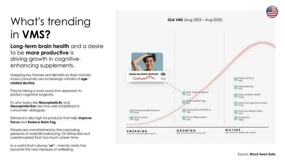 - 需求转变: 从即时的“提神醒脑”(如咖啡因)转向长期的“大脑保养”(Brain Longevity),关注神经可塑性、神经保护等。