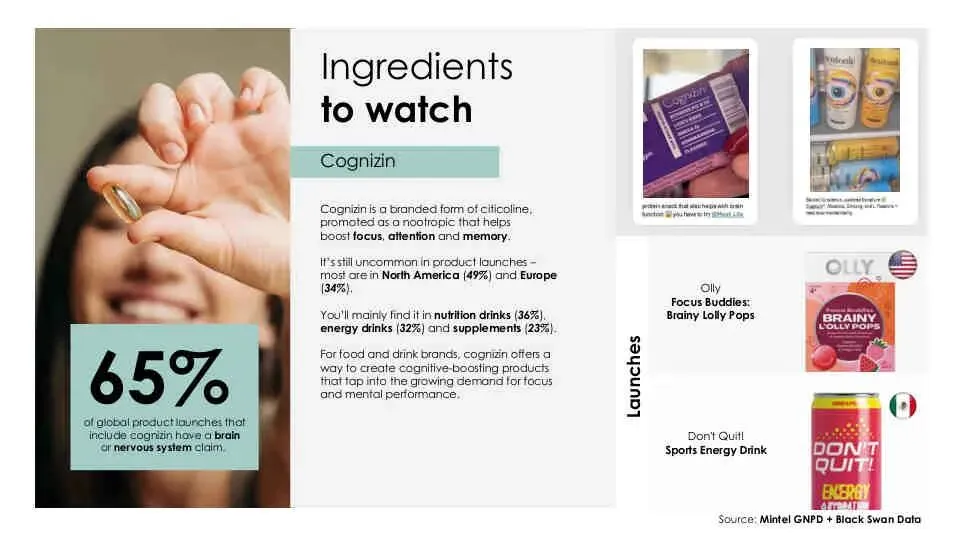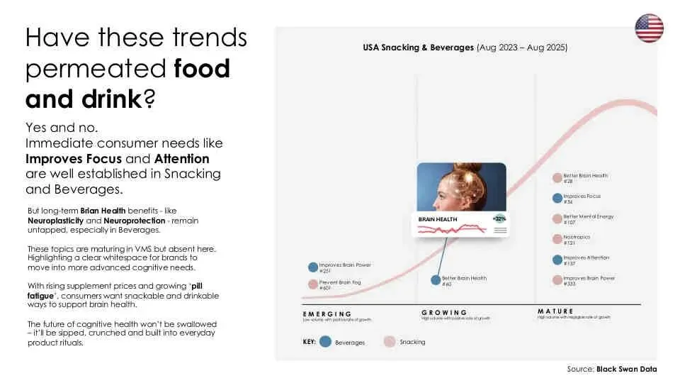 - 市场空白: 食品饮料在“长期大脑健康”方面存在巨大机会,目前多停留在“提升专注力”等短期功效。