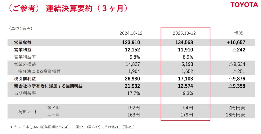 日前,丰田汽车正式公布2025财年第三财季(2025年10-12月)及前三财季(2025年4-12月)财务数据。数据显示,丰田汽车第三财季营业收入达13.46万亿日元,同比增长8.6%,但净利润却遭遇“腰斩式”下滑,仅为1.26万亿日元,同比下滑43%。前三财季,丰田汽车营业收入为38.09万亿日元,同比增长6.8%,净利润3.03万亿日元,同比下滑26.1%。对于利润下滑,丰田汽车表示,主要受美国关税政策冲击,这一项负面影响就达1.2万亿日元,直接吞噬了大量营收增长带来的收益。