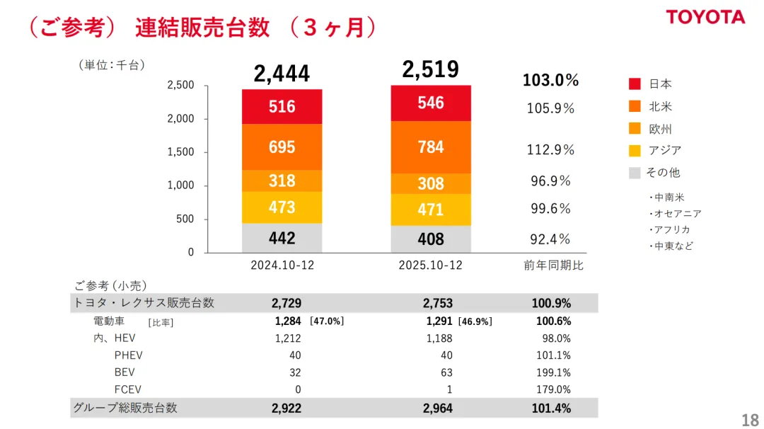 尽管利润承压,但丰田的全球销量依旧保持强势。数据显示,丰田汽车第三财季销量251.9万辆,同比增长3.0%,2025年前三财季丰田汽车累计销量730.2万辆,同比增长4.3%,日本和北美市场成为主要增长引擎。值得一提的是,电动化转型成效初显,受北美、中国等市场混合动力汽车销量大涨推动,丰田电动化车辆销量占比已提升至46.9%,成为销量增长的重要支撑。