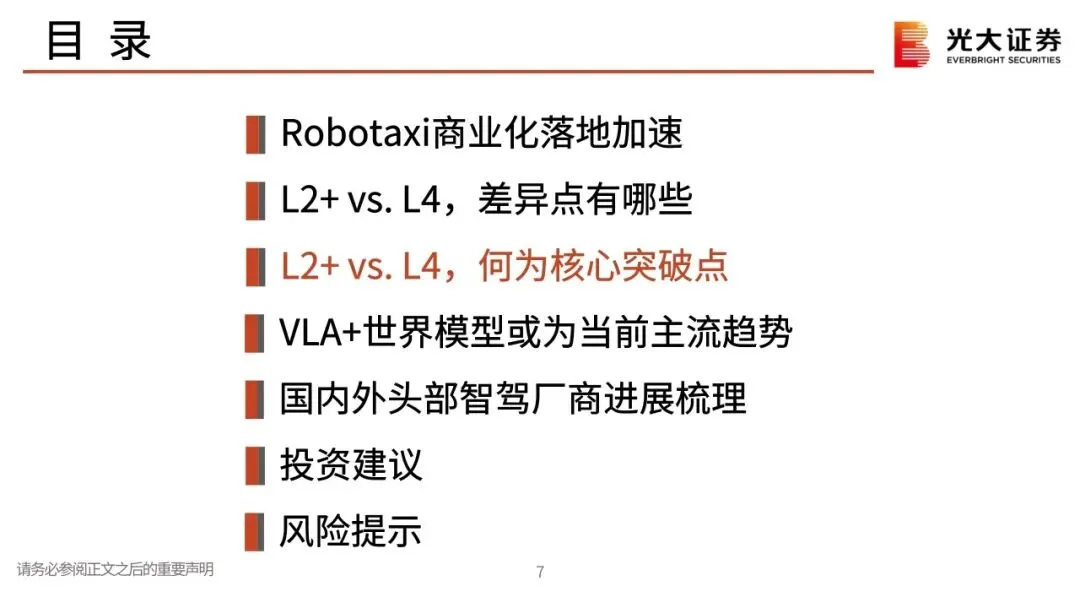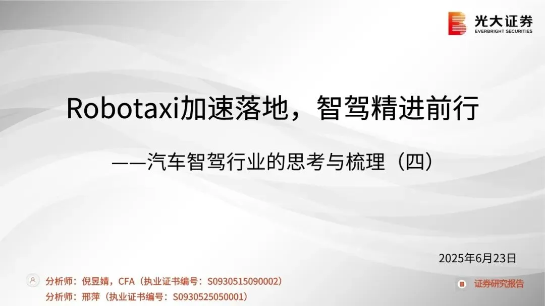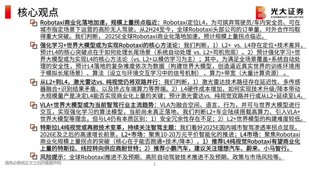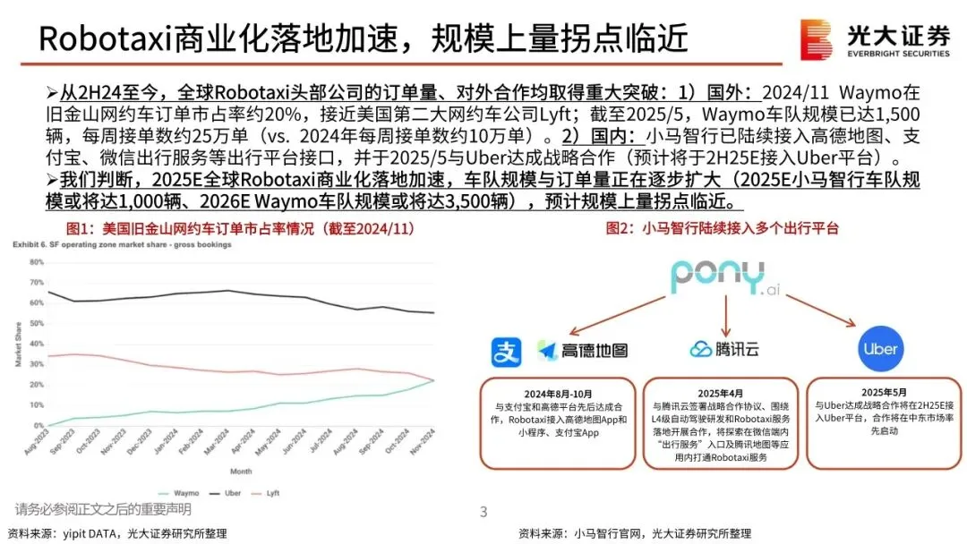 Robotaxi商业化落地加速,规模上量拐点临近:Robotaxi定位L4,为可摈弃驾驶员/车内安全员、可在城市指定场景下运营的高阶无人驾驶。从2H24至今,全球Robotaxi头部公司的订单量、对外合作均取得重大突破。我们判断, 2025E全球Robotaxi商业化落地加速,预计规模上量拐点临近。