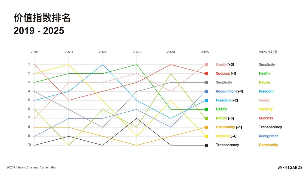 Avantgarde联合Trendbüro发布的2025年上半年中国消费者价值取向指数报告,基于微博495万条、小红书20万+条消费相关数据,分析了2019-2025年消费者核心价值取向的变迁,2025年“家庭”跃居价值指数首位,成功、简约紧随其后,小红书平台的价值排序则呈现出健康、自然、自由等维度的高关注度,整体反映出消费者价值取向向多元化、个体化、情感化深度演变的特征。