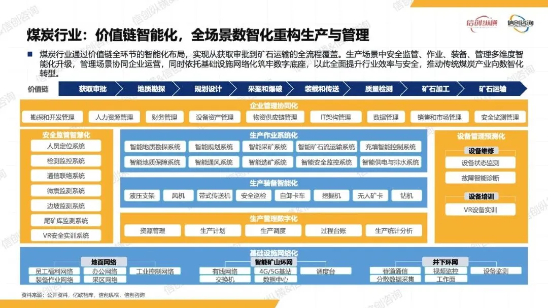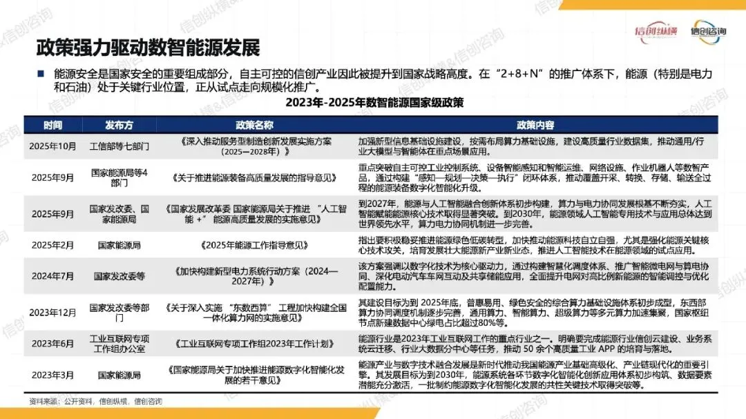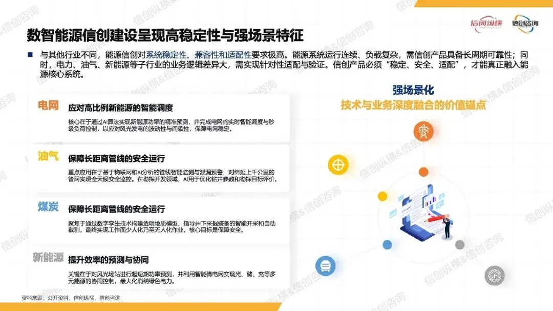 能源数智化(2025-2035 年):数字孪⽣、AI 技术与能源业务深度融合,推动⽣产全链条智能化,如智能矿⼭⽆⼈开采、虚拟电⼚动态调度,信创开始嵌⼊关键环节;