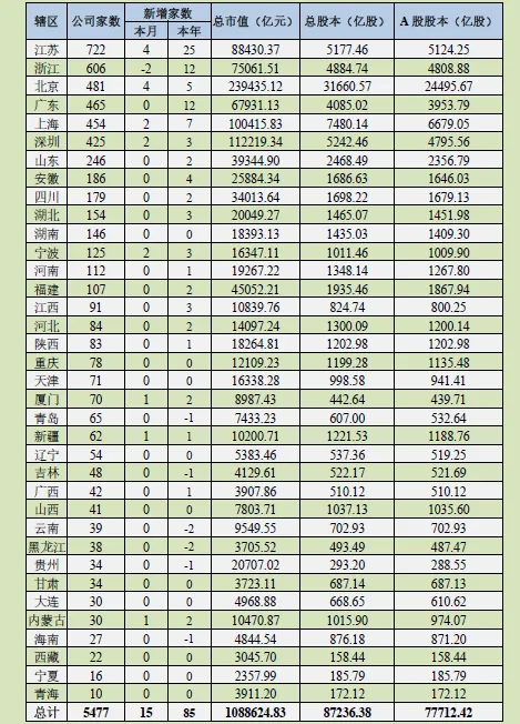 按照上市公司所在区域的统计,可以反映出各省市的经济实力。值得注意的是,目前我国有5个计划单列市,包括:深圳、大连、青岛、宁波、厦门,数据单独统计报送,和所属的省份并列。