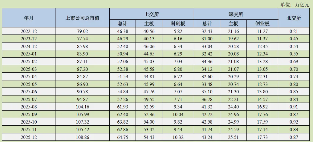 2025年末,境内上市公司总市值108.86万亿元,其中: