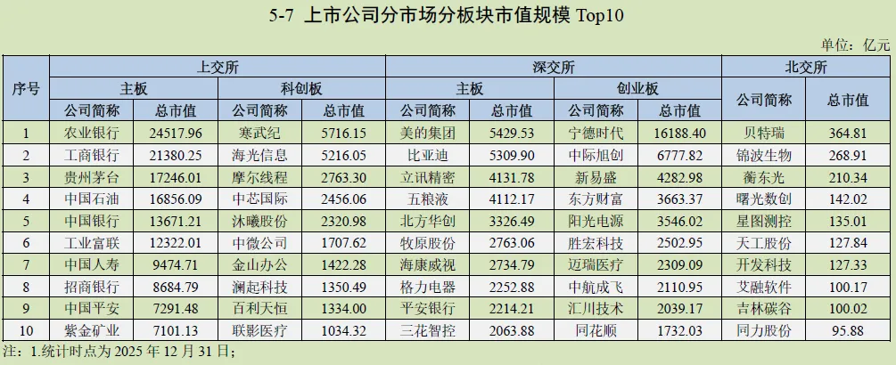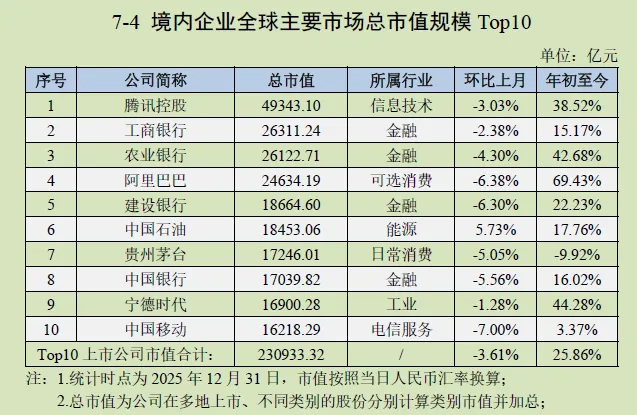 2025年末,境内企业全球主要市场总市值规模Top10,分别是腾讯控股、工商银行、农业银行、阿里巴巴、建设银行、中国石油、贵州茅台、中国银行、宁德时代和中国移动。