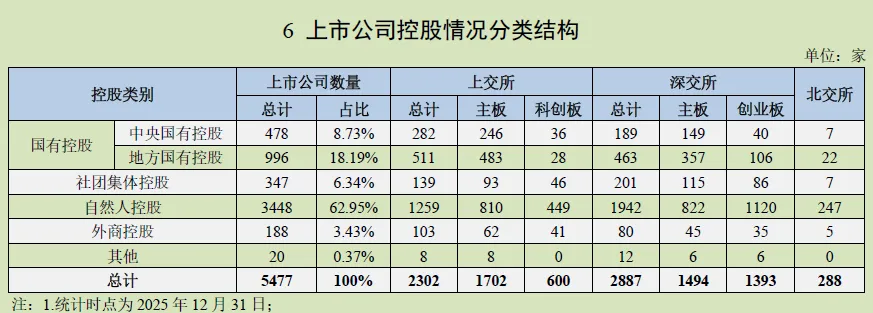 根据上市公司控股类别划分,2025年末的5477家公司中: