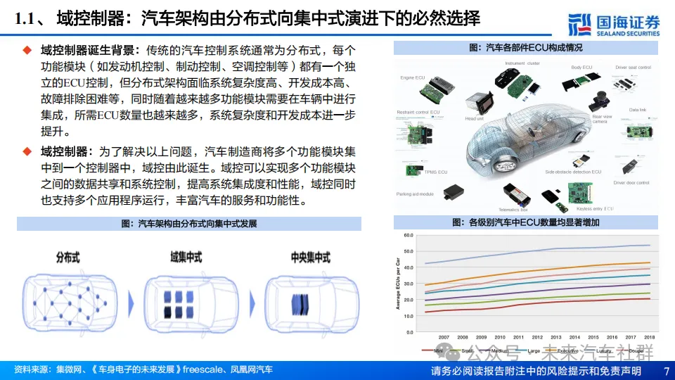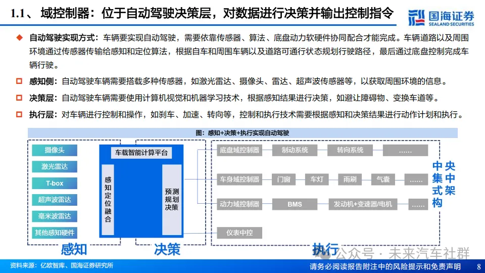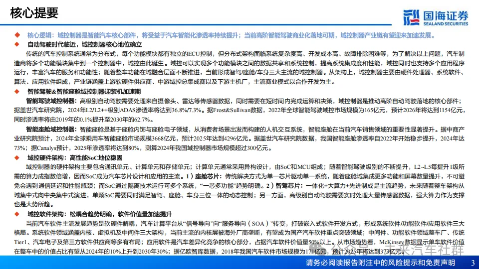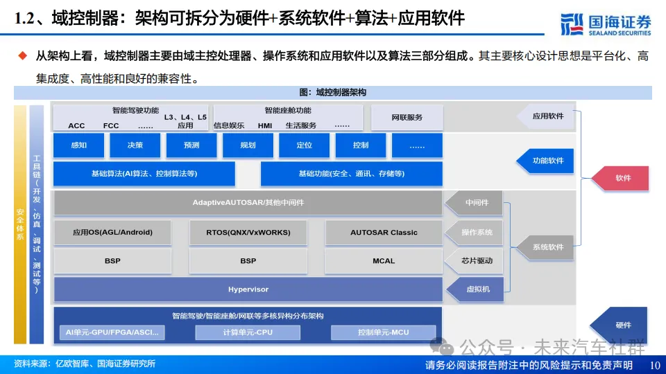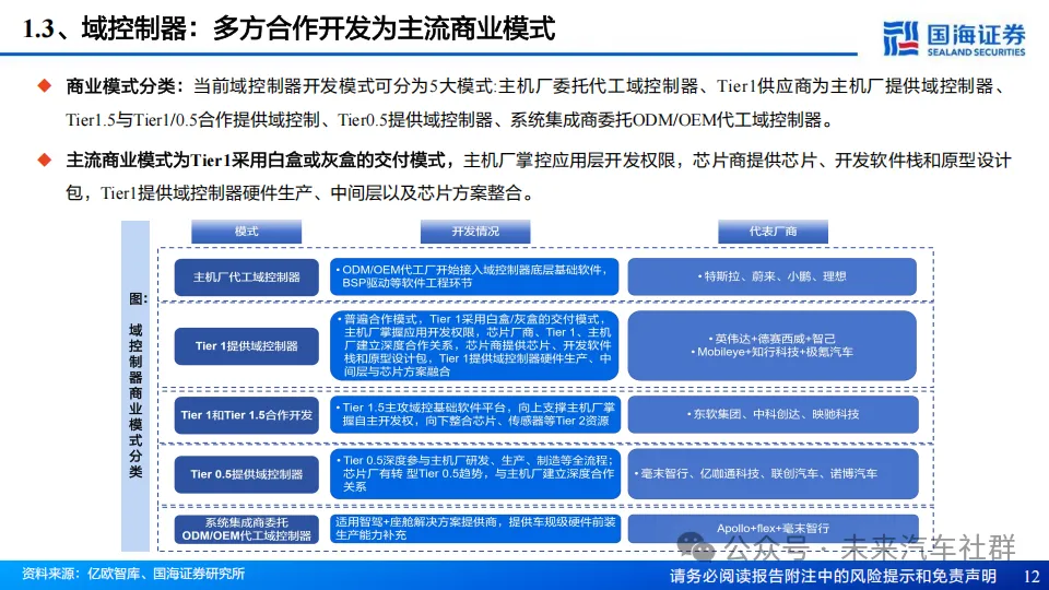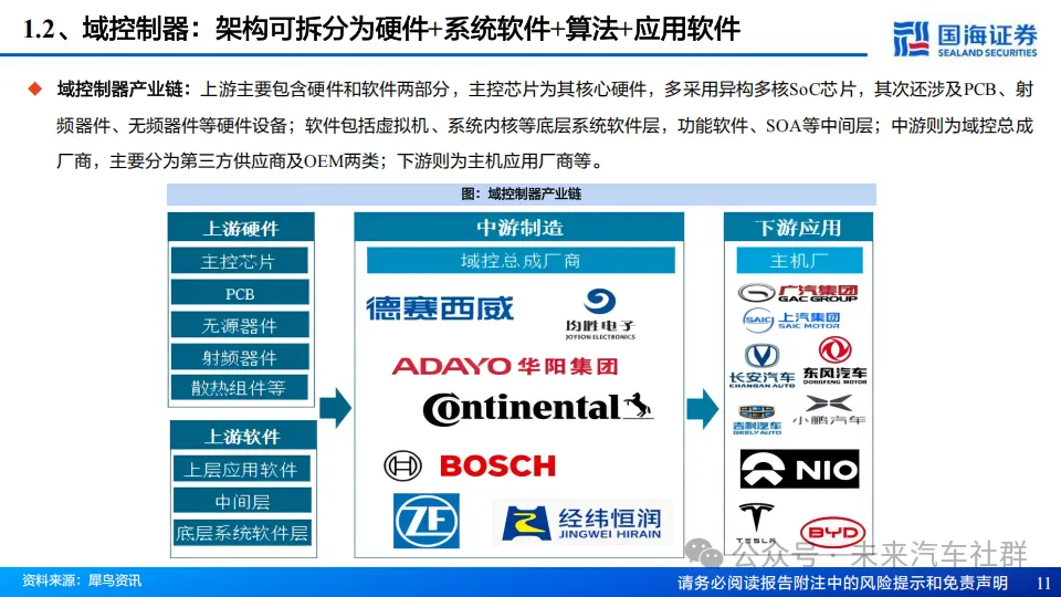 传统的汽车控制系统通常为分布式,每个功能模块都有独立的ECU控制,但分布式架构面临系统复杂度高、开发成本高、故障排除困难等,为了解决以上问题,汽车制造商将多个功能模块集中到一个控制器中,域控由此诞生。域控可以实现多个功能模块之间的数据共享和系统控制,提高系统集成度和性能,域控同时也支持多个应用程序运行,丰富汽车的服务和功能性;随着整车功能在域融合层面不断推进,当前形成智驾/座舱/车身三大主流的域控制器。从架构上,域控制器主要由硬件处理器、系统软件、算法、应用软件组成,产业链涵盖上游软硬件供应商、中游域控总集成商以及下游主机厂,主流商业模式以合作开发为主。