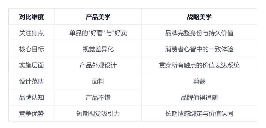 产品美学关注的是单品的"好看"与"好卖",而战略美学则是将美学作为品牌顶层设计的核心维度,贯穿品牌所有触点,在消费者心智中构建完整的品牌身份,一致体验与持久价值。简言之,产品美学是点状的视觉设计,战略美学是系统性的价值表达。