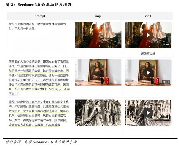 4)字节跳动旗下Seedance2.0视频模型,降低内容创作门槛。2月10日,据财联社消息,近日字节跳动旗下Seedance2.0视频模型进行内测,目前在字节旗下豆包、小云雀app可使用。据即梦Seedance 2.0的官方使用手册,Seedance 2.0支持文本、图片、视频、音频四种模态输入,同时模型的基础能力增强,物理规律更合理、动作表现更自然流畅、指令理解更精准、风格保持更稳定,不仅能稳定完成复杂动作、连续运动等高难度生成任务,也让整体视频效果更真实、更顺滑。
