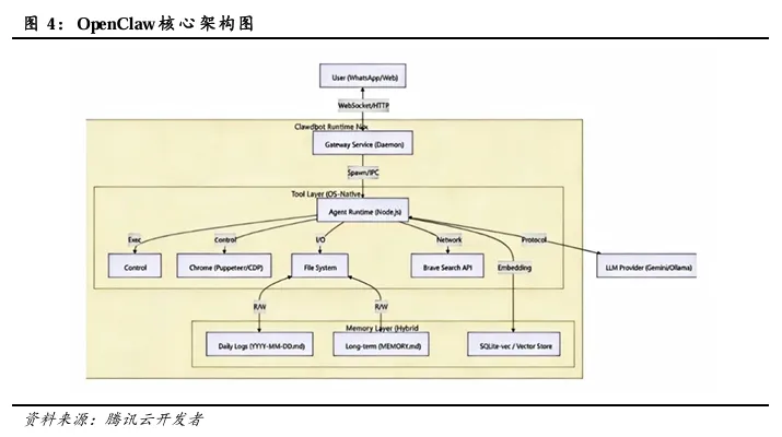5)OpenClaw个人自主开源AI智能体引起关注。OpenClaw(曾用名ClawdBot、Moltbot)是2026年初全球爆红的开源自主AI智能体,由奥地利开发者Peter Steinberger推出,凭借本地部署、聊天交互、全流程自主执行的特性,快速成为AI Agent领域现象级项目推动个人与办公自动化进入新阶段。OpenClaw定位为本地自托管个人数字员工,以大模型为决策核心,通过即时通讯工具(Telegram、WhatsApp、飞书等)交互,无需独立APP,实现“聊天即操作”。它可直接调用本地文件、浏览器、终端命令与第三方API,完成从任务拆解到执行反馈的闭环,区别于传统对话式AI的被动应答模式。