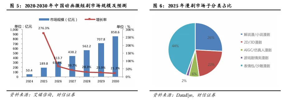 中国动画微短剧行业正快速增长,AI漫剧成为关键动能。据艾媒咨询数据,2025年中国动画微短剧市场规模达189.8亿元,同比增加276.3%,预计2026年市场规模攀升至313.7亿元。据DataEye数据,按视觉画风分类,漫剧可划分表情包漫(占比44%)、解说/小说漫(26%)、2D/3D漫(22%)等。从短剧自习室整理的2025年抖音累计播放量TOP10的剧目来看,AI漫占据5席,在内容产出规模和市场份额上实现了大幅增长,该品类是驱动市场增长的重要力量。