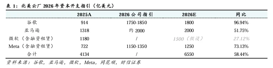 指引乐观,2026年四大云厂资本开支有望同比增长58.44%。根据各家公司指引,谷歌预计公司2026年资本开支约为1750亿至1850亿美元,取中值为1800亿美元,同比增长96.94%;亚马逊预计公司2026年资本开支约为2000亿美元,同比增长约51.75%;Meta预计公司2026年资本开支约为1150亿至1350亿美元,取中值为1250亿元;微软未给出明确指引,我们假设公司2026年资本开支约为1500亿美元,同比增长27.12%。上述四家公司2026年资本开支合计约6550亿美元,同比增长58.44%。高基数背景下,云厂资本开支有望在2026年继续实现高增长,有望拉动服务器需求,为AI硬件产业带来发展机遇。