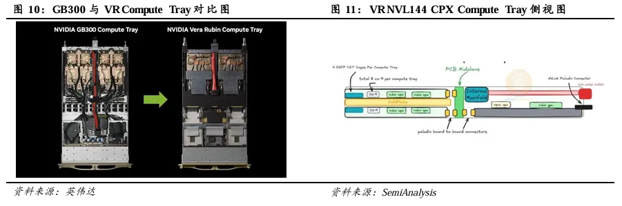 Rubin平台取消托架内部线缆,CPX配置增加中板及CPX板。为提高组装效率,解决传统有线缆托盘在装配与运维中的问题,Rubin平台采用无线缆、无软管、无风扇设计的计算托盘架构。VR NVL144 CPX采用无线缆设计,并增加中板(Midplane)与CPX板。VR NVL144 CPX 采用无线缆设计,Overpass被替换为Paladin板对板连接器,与位于机箱中间的中板相连,连接OSFP接口笼(cage)与Connect X网卡的线缆、连接PCIe至前端Bluefield DPU及本地NVMe存储的线缆,以及其他侧边带线缆均被取消。