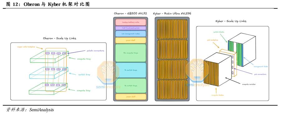 3)PCB背板替代铜缆背板。考虑在更小的空间内布置电缆的难度过高,Kyber将采用PCB背板取代铜缆,作为GPU与机架内NVSwitch之间的扩展链路。机架背面的NVSwitch托盘通过PCB背板的背面连接到计算托盘。