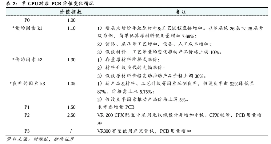 综合考虑上述因素,单GPU对应PCB价值可由1.00增长至1.50,上涨50%。进一步,我们考虑PCB的增量:1)如VR200 CPX配置中采用无线缆设计并增加中板、CPX板等,价值有望进一步从1.50提升至2.50;2)VR300中有望再增加正交背板,推动PCB价值进一步增长。
