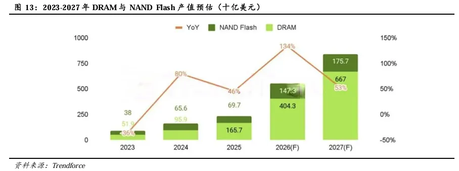 AI驱动下存储产业产值将逐年攀升,预估2027年行业产值年增率将超50%。AI产业重心由模型训练转向大规模推理应用,更强调实时响应能力与数据存取效率,带动服务器端对高容量、高带宽DRAM的需求持续扩大,单机搭载容量亦同步提升。此外,英伟达在Vera Rubin平台的推广中,强化了对高效能存储的需求,推升了企业级SSD的重要性。为了在Token生成效能与成本之间取得平衡,CSP厂商正加速采用大容量QLC SSD以应对海量数据存取。在需求持续扩张及供给端产能有限的供需格局背景下,存储价格持续上扬,驱动存储器产业产值逐年创高,根据Trendforce,预估2026年存储器产值将达到5516亿美元,同比增长134%,预估2027年行业产值将再创高峰达8427亿美元,同比增长53%。其中DRAM产值2026年将增长至4043亿美元,年增率高达144%;NAND Flash行业产值将同比增长112%至1,473亿美元。