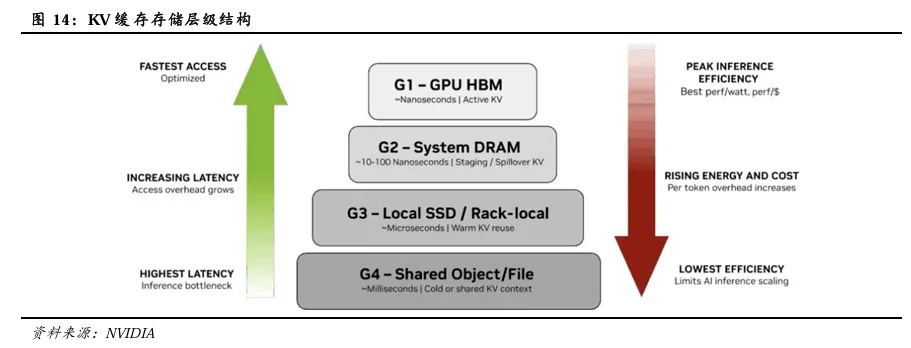 现有的内存和存储层层级结构中,随着推理上下文持续扩展,其流转机制依次为GPU HBM(G1)、系统 RAM(G2)、本地 SSD(G3)、共享存储(G4)。在整个存储层级架构的顶层,GPU HBM(G1)除用于承载模型权重外,因其可提供纳秒级访问和超高效率,亦直接用于token生成的活跃KV缓存。随着上下文超出HBM的物理限制,KV缓存会扩展到系统DRAM(G2)和本地/机架内存储(G3)中,此时访问延迟会增加,每个token的能耗和成本开始上升。虽然这些层级扩展了有效容量,但每向下迁移一个层级,都会产生额外的开销,从而降低整体效率。在整个存储层级架构的底层,共享对象和文件存储(G4)可提供持久性和存储容量,但延迟将达到毫秒级,推理效率也是最低的。虽然它适用于存储访问频率较低的或共享的数据资产,但将活跃或频繁复用KV缓存保存到此层级会增加功耗,并直接限制AI扩展的成本效益。