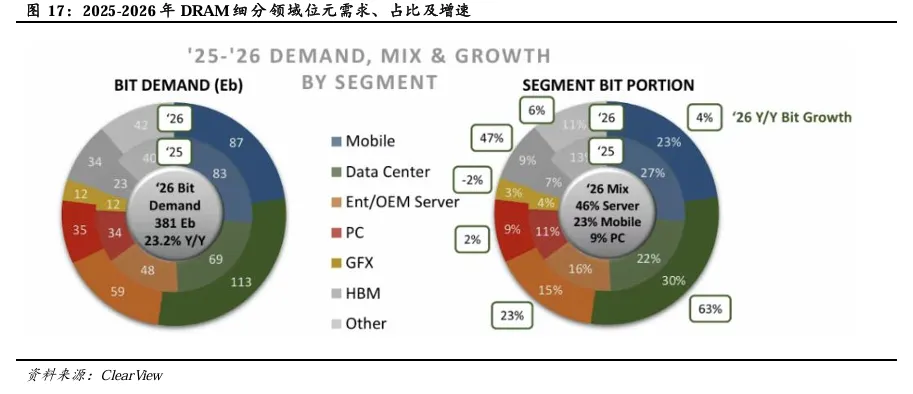 预计2026年数据中心DRAM需求增速将跃升至63%,成为最大增长引擎。根据Clearview, 2026年全球DRAM总需求预计达381Eb,同比增长23.2%。预计服务器DRAM需求将达172Eb(Data Center/Ent/OEM Server),占总需求近一半。数据中心DRAM需求占比预计将从2025年的22%跃升至2026年的30%,位元需求增速达63%,成为最大增长引擎。