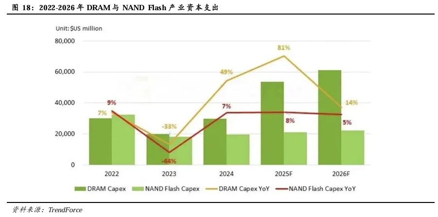 行业厂商将加大2026年资本支出力度。根据TrendForce,2026年各主要原厂DRAM与NAND Flash后续的资本支出将持续上涨,其中,DRAM产业的资本支出在2025年预计将达到537亿美元,预计在2026年进一步增长至613亿美元,年增率达14%。NAND Flash部分,资本支出在2025年预计为211亿美元,2026年预计小幅增长至222亿美元,年增约5%。