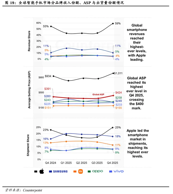 全球智能手机市场正持续以“价值扩张”为主线实现增长。根据Counterpoint Research报告,2025年第四季度,全球智能手机市场收入同比增长13%,达到1430亿美元,创下单季度历史新高;然而出货量仅同比增长5%,显著低于收入增幅。收入增长的核心驱动力在于高端化趋势加速,叠加物料成本上升等因素,推动智能手机平均售价(ASP)同比上涨8%,首次在单季度突破400美元。数据表明,市场增长更多源于“卖得更贵”,而非“卖得更多”,这反映出行业逻辑已从“以量取胜”转向“以价补量”,高端化成为当前市场增长的首要动力。同时,AI功能(如影像增强、实时翻译、生成式交互)正成为高端机型实现差异化的核心所在,直接拉动了用户的换机意愿与产品溢价空间。