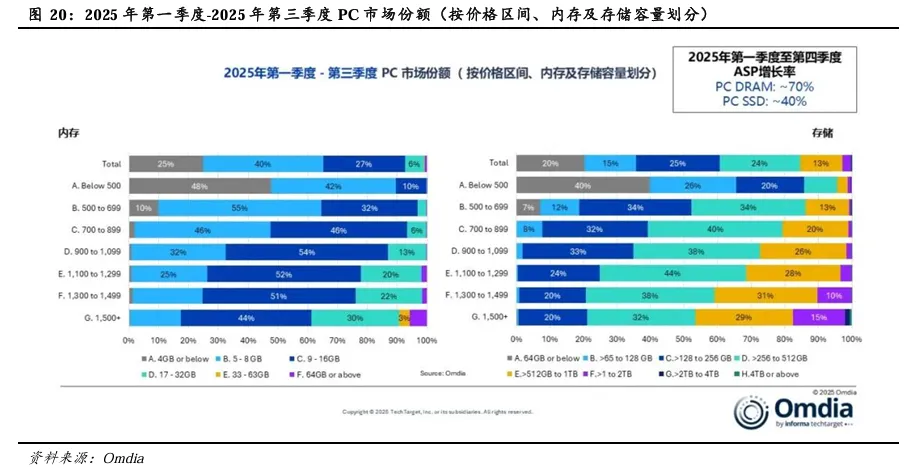存储与内存供应趋紧,PC行业正着力提升高端产品占比。2025年全球PC市场整体表现良好,但自年中起,存储与内存供应趋紧,同时伴随价格上行压力;至2025年12月,PC厂商已开始释放涨价预期,而供应不足也已经对2026年的出货预期形成抑制。Omdia分析指出,从2025年第一季度到第四季度,主流PC内存与存储成本上涨了40%至70%,导致成本压力最终传导至客户。鉴于2026年供应端仍将紧张,厂商正着力提升高端产品占比,聚焦于AI端侧算力优化与OLED屏幕普及,并适度精简中低端配置,以保障利润率。