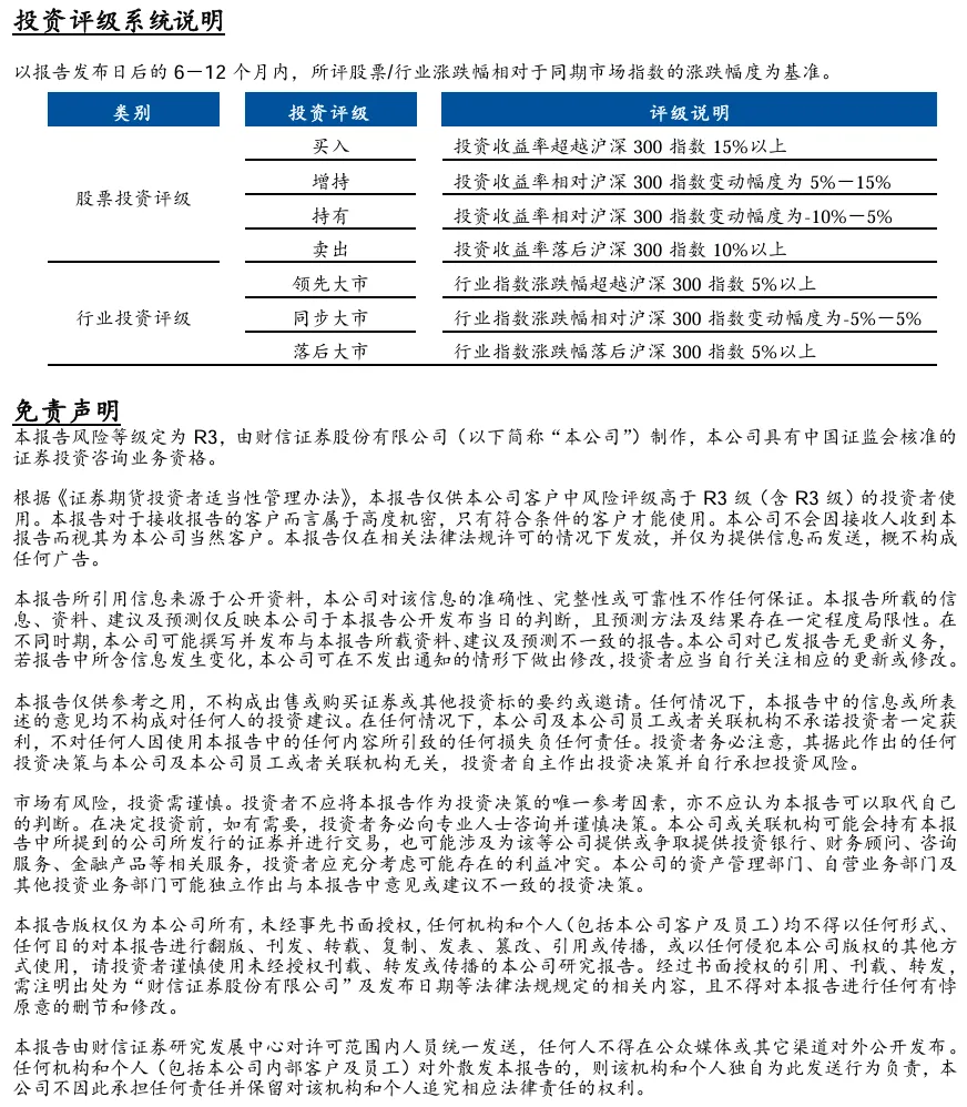 财信证券对本订阅号所载资料的准确性、可靠性、时效性及完整性不作任何明示或暗示的保证。本订阅号中资料、意见等仅代表来源证券研究报告发布当日的判断,相关研究观点可依据财信证券后续发布的证券研究报告在不发布通知的情形下作出更改。财信证券的销售人员、交易人员以及其他专业人士可能会依据不同假设和标准、采用不同的分析方法口头或书面发表与本订阅号中资料意见不一致的市场评论或观点。