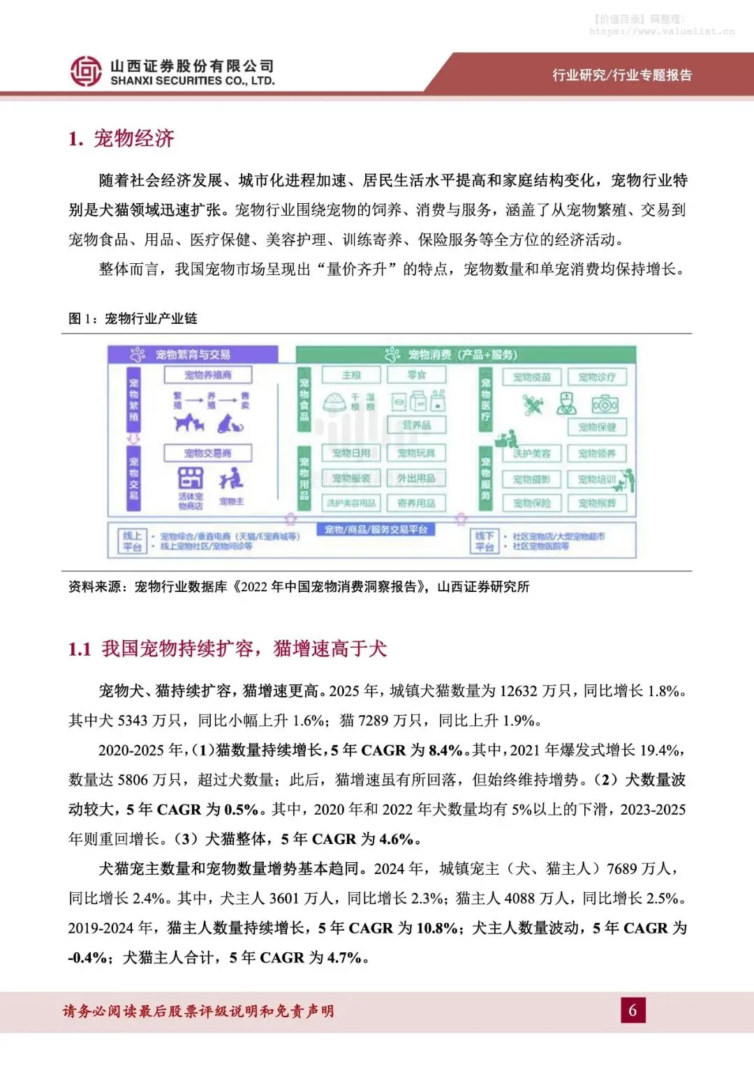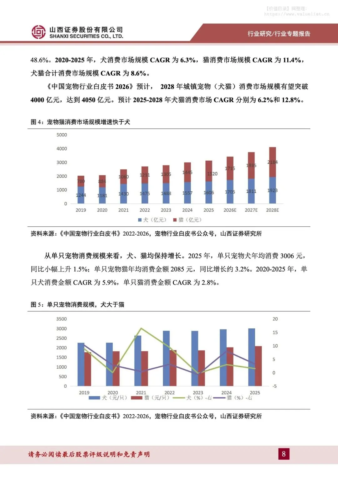 ►我国宠物持续扩容,猫经济盛行。(1)宠物数量:2025年,我国城镇犬猫数量为1.26亿只/yoy+1.8%;2020-2025年,犬猫数量CAGR为4.6%,其中猫数量CAGR为8.4%。(2)市场规模:2025年,城镇宠物(犬猫)消费市场规模突破3126亿元/yoy+4.1%;2020-2025年,犬猫消费市场规模CAGR为8.6%,其中猫消费市场规模CAGR为11.4%。