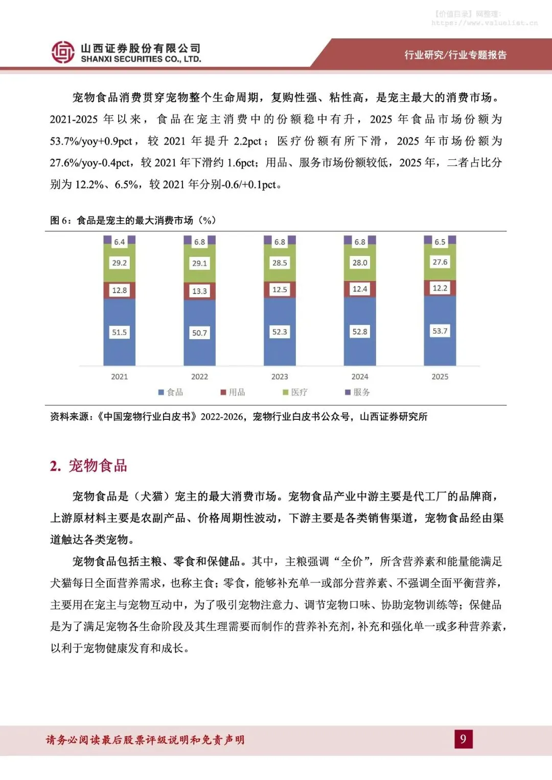 (2)需求结构:“精准喂养+消费升级”趋势。养宠人群年轻化(2025年,90后&00后占比69.0%),宠物喂养拟人化,宠食从“有”到“好”再到“精”,营养配比、配料组成显著影响主粮选择。据天猫,以湿粮、烘焙粮、冷鲜粮、冻干粮、处方粮等为代表的高端新工艺宠物食品,在天猫平台的消费占比持续走高。