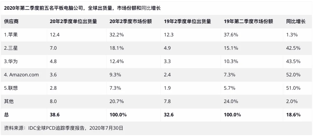 上图是IDC发布的2020年第二季度全球平板电脑市场出货量TOP 5:①苹果 出货量1240万台,市场份额32.2%,同比增长1.3%;②三星 出货量700万台,市场份额18.1%,同比增长42.5%;③华为 出货量480万台,市场份额12.4%,同比增长43.5%;④亚马逊 出货量360万台,市场份额9.3%,同比增长52%;⑤联想 出货量280万台,市场份额7.3%,同比增长51%。