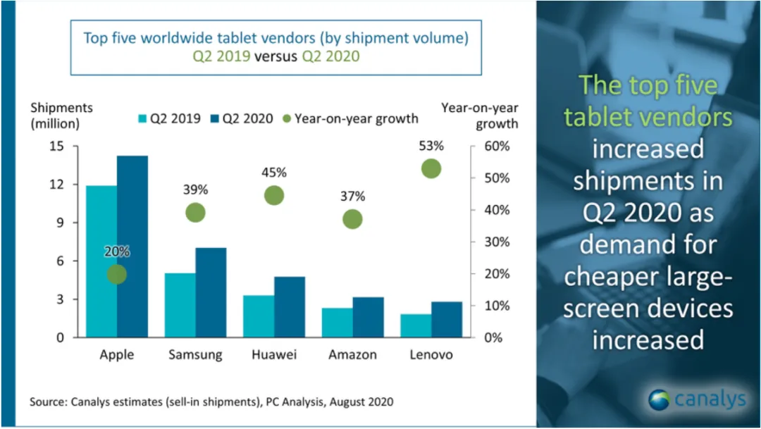 市调机构Canalys发布的2020年Q2全球平板电脑出货量报告排名和IDC一样,TOP 5依次是苹果(38%)、三星(18.7%)、华为(12.7%)、亚马逊(8.4%)、联想(7.5%),不过细节上各家出货量的一些数据有些出入。