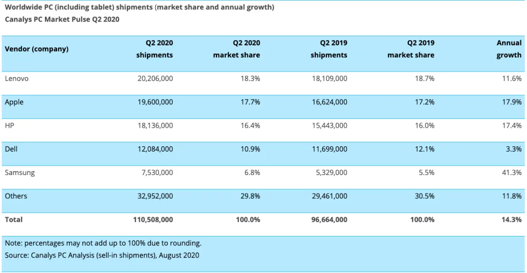 另外,Canalys还有个把Pad包含在内的2020年第二季度全球PC整体市场报告,报告显示,Q2整个全球PC市场(包括平板电脑、台式电脑和笔记本电脑)出货量达1.105亿台,同比增长14%,TOP 5也均是增长状态。
