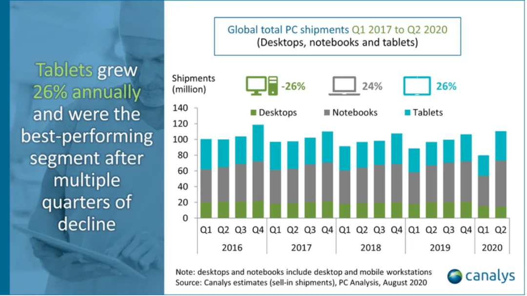 整体来说,2020年第二季度全球平板电脑市场出货量达3750万台,同比增长26%,受疫情等因素在家办公学习的影响不小~